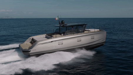 Externamente, o design enfatiza a "elegância prática", com uma plataforma transformadora na popa que funciona como degrau de embarque e lançamento de botes. Esse recurso hidráulico desce até o nível da água, revelando um amplo espaço para armazenamento de brinquedos e equipamentos, enquanto um amplo solário se integra acima dele para descanso. O cockpit se concentra em uma grande mesa dobrável, protegida por um teto rígido de fibra de carbono, complementado por um discreto bar molhado. As faixas laterais e as superfícies planas em madeira de teca oferecem amplo espaço para itens pessoais, e o acesso inteligente ao convés lateral garante um movimento seguro para a proa e para a popa. À frente, um amplo solário convida ao relaxamento, com corrimãos integrados no para-brisa para segurança e um rack de teto para pranchas de stand-up paddle ou infláveis.